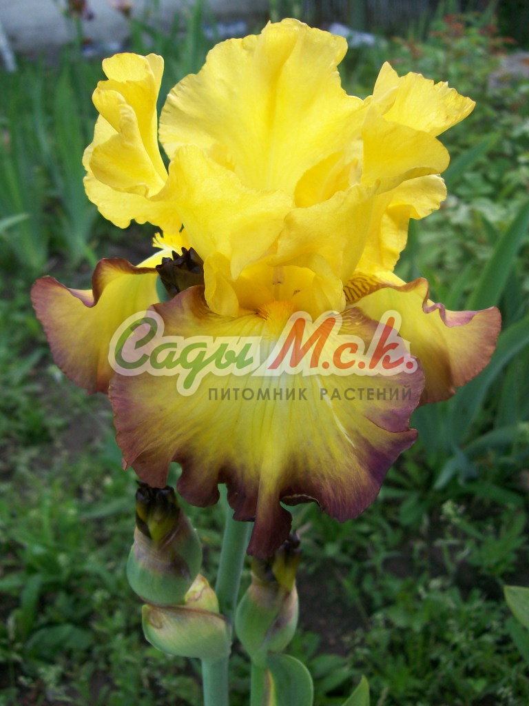 Ирис бородатый Аффайр - белые с фиолетовым отливом стандарты, фолы горчично-жёлтые с тонкой сиреневой каймой и горчичной бородкой. Группа Высоких бородатых ирисов, высота куста 75 см.