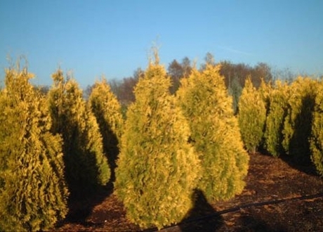 Туя западная Europa Gold - кустарник 3-4 м высоты и диаметром 1-1,2 м. Крона узкопирамидальная, с возрастом коническая. Хвоя чешуйчатая, густая, при распускании оранжевая, зимой золотисто-желтая. Сорт широко распространен.